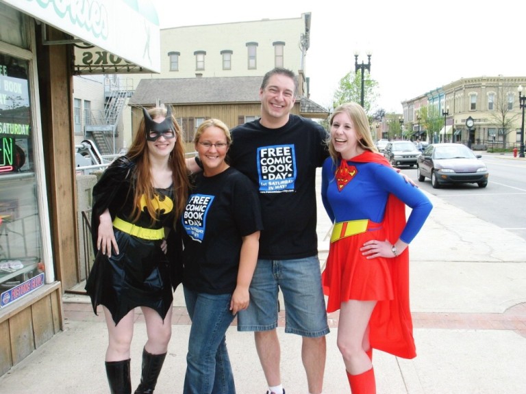 2007 FREE COMIC BOOK DAY WAS AN ABSOLUTE BLAST! This was our way of showing everyone all of the cool stories that the world of comic books has to offer! We gave away hundreds of FREE comic books, gave away prizes and had special appearances by live super-heroes (and one villain)! THANK YOU to everyone that stopped out and to all the friends of Rookies for helping! Check out some of our pics! (click to enlarge) Molly with her parents and older sister (winner of our 6-Foot Spider-Man giveaway) |